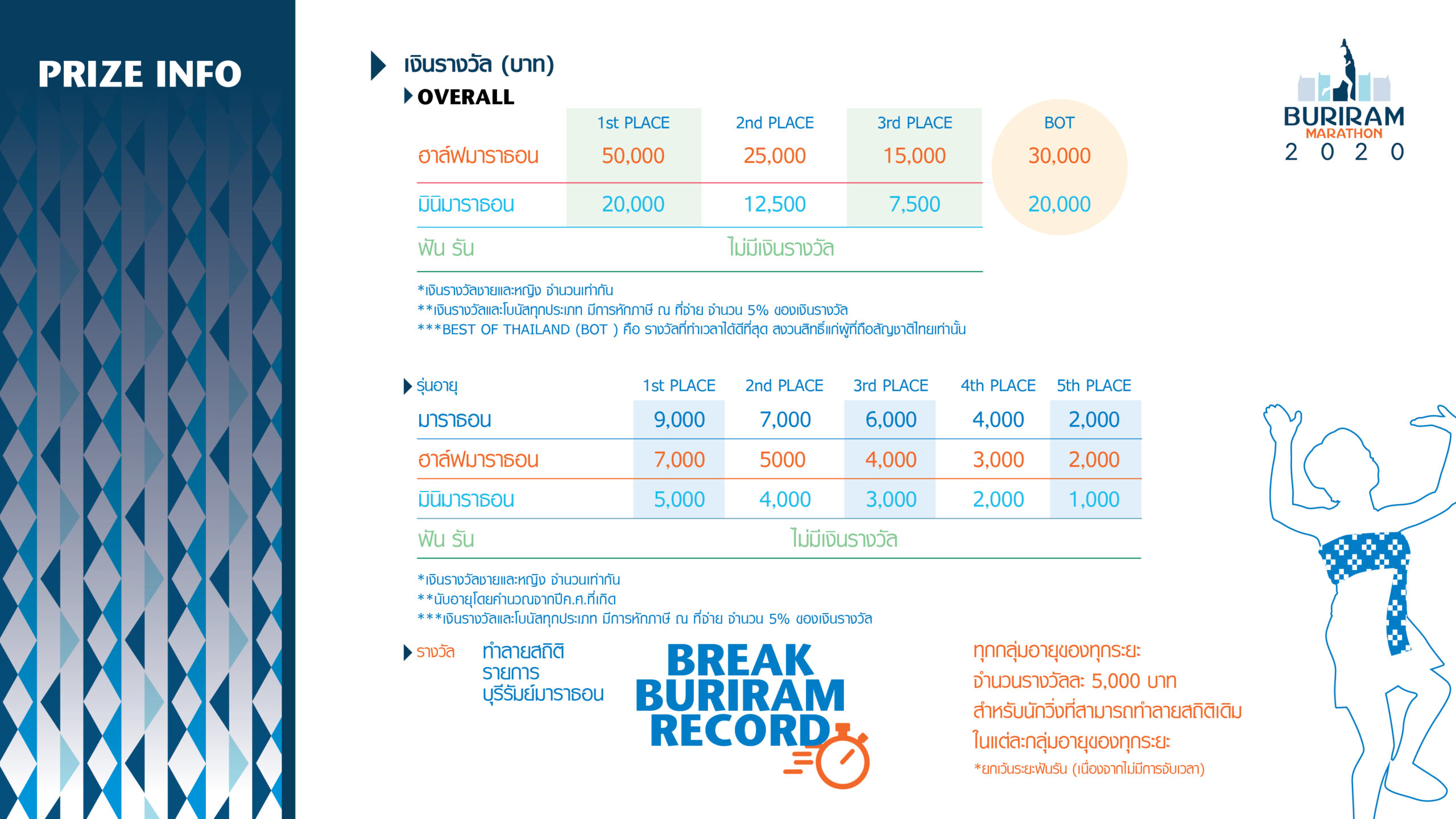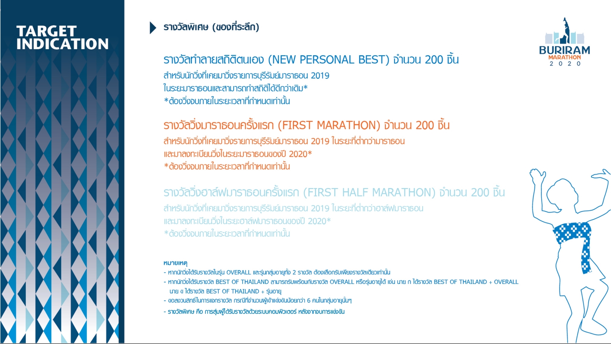 - นักวิ่งที่ได้รับรางวัลทุกประเภทจะต้องแสดงบัตรประชาชนหรือบัตรที่ออกโดยหน่วยงานราชการที่มีเลขบัตรประชาชนและติดรูปถ่าย หรือหนังสือเดินทางมาแสดง เพื่อขอรับรางวัลตามประกาศภายในเวลาที่กำหนด มิฉะนั้นจะถือว่าไม่สามารถรายงานตัวได้และถูกตัดสิทธิ์การรับรางวัล