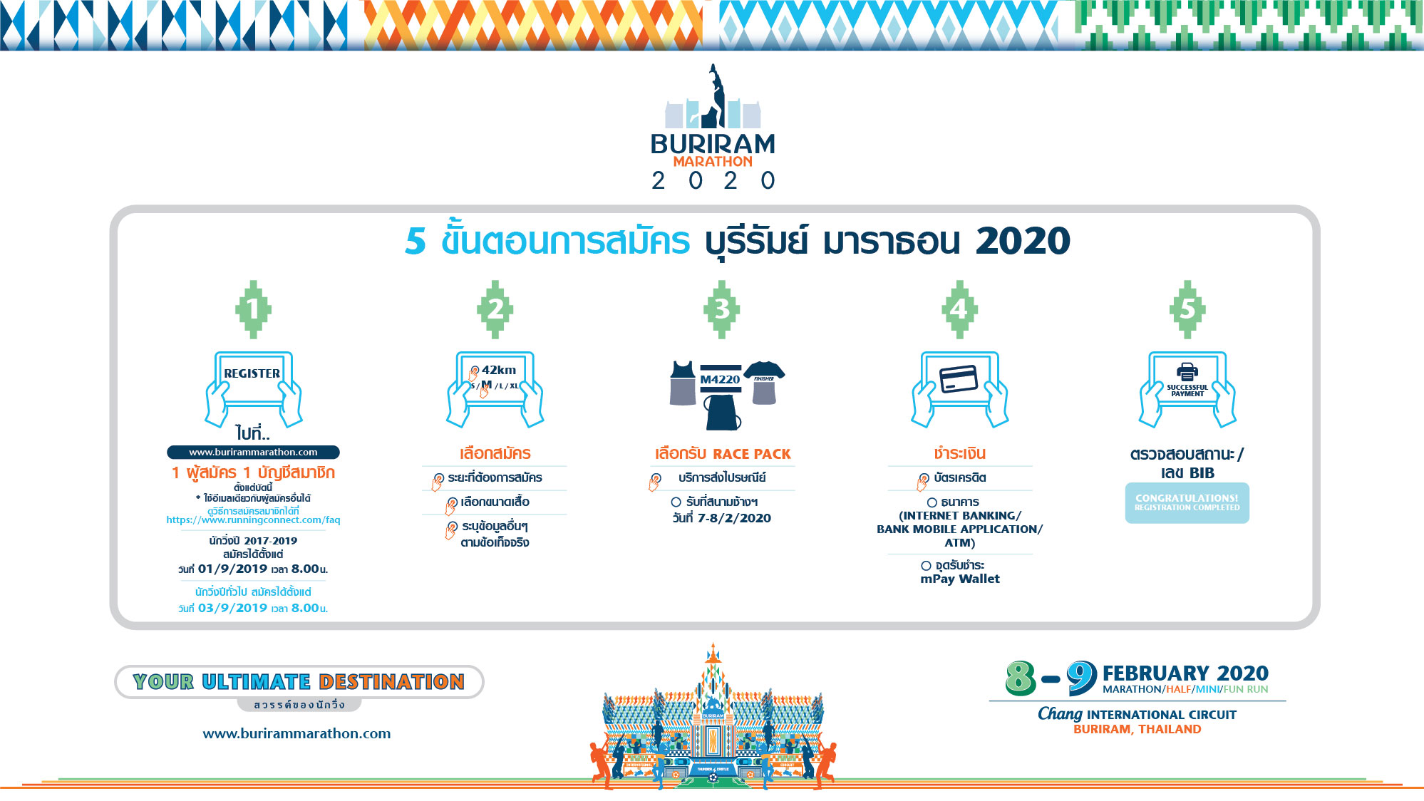 • ผู้สมัครสามารถเลือกที่จะรับอุปกรณ์การแข่งขันโดยการส่งไปให้ที่ที่อยู่ที่กำหนดโดย EMS หรือผู้ให้บริการจัดส่งอื่นๆ หรือเลือกที่จะรับที่ Expo ในวันศุกร์ที่ 7 และวันเสาร์ที่ 8 กุมภาพันธ์ 2563 ที่ช้างอารีนา จ.บุรีรัมย์ (GPS